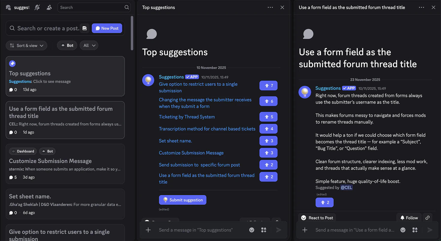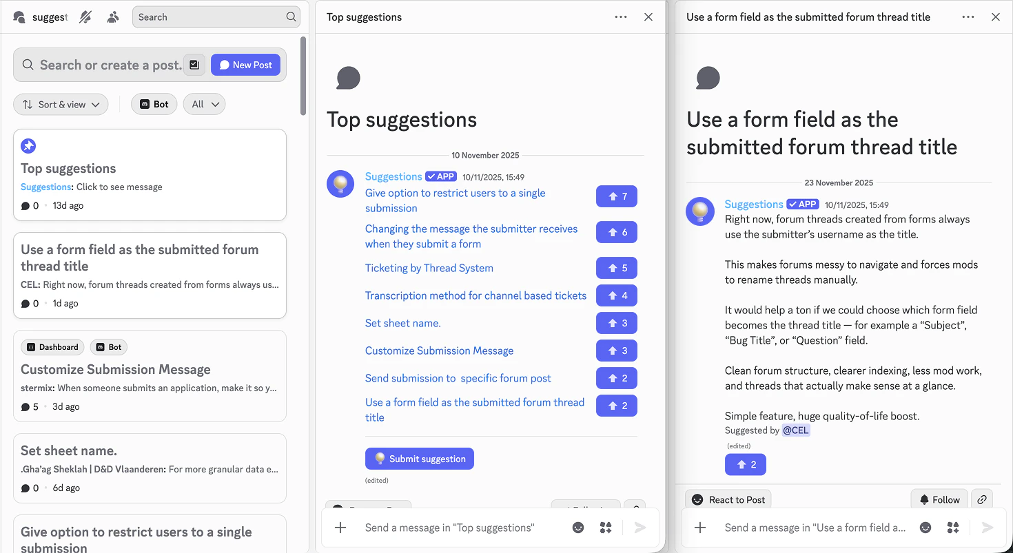 Suggestions seamlessly integrates with forum channels, while also providing a way to easily view and vote on the top suggestions in the server.